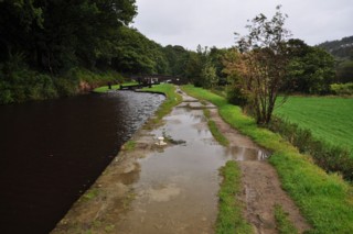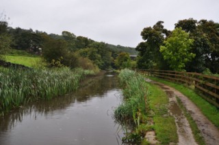 Looking to the East, the towpath of the Huddersfield Narrow Canal to the West of Golcar Brook Lock No.15E.