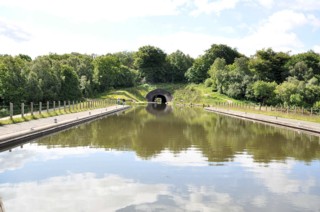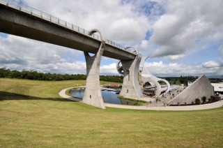 | L'Écluse du Cinquantième Anniversaire vue du Confluent du Canal Forth & Clyde. À l'arrière, la Roue de Falkirk.