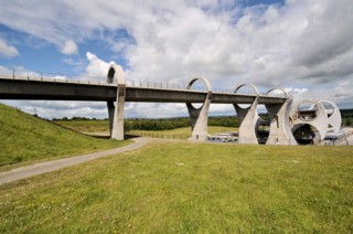 Golden Jubilee Lock seen from the junction with the Forth & Clyde Canal. At the back, the Falkirk Wheel.